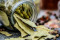 Продукти: 800 г свинско контрафиле 150 г пушено сирене 4 с.л. горчица 2 с.л. захар 4 с.л. вода масло сол черен пипер кимион чесън на прах Рецепта: Захарта (2 с.л.) се карамелизира в подходящ съд на котлона. Добавят се водата (4 с.л.) и малко масло и се оставя да заври. Свинското контрафиле (800 г) се реже на тънки порции, без да се стига до края с ножа, така че да стане като ветрило. Посолява се и се натърква с подправките. Оставят се да престоят половин час. След това порциите се намазват първо с горчицата (4 с.л.), а след това - с карамеления сос. Във всеки разрез се поставя по едно парче топено сирене. Контрафилето се притиска плътно, за да се събере в едно цяло, увива се в готварско фолио и се пече в предварително загрята фурна за 1 час на 180 градуса. След това фолиото се отстранява и се допича, докато получи хрупкава златиста коричка. Поднася се в плато върху картофено пюре, декорирано с морковени ивици и шушулки варен зелен боб. Може да се гарнира и с варен ориз със зеленчуци, както и със зелена салата. Подходяща напитка за това ястие е плътното червено вино или качествената бира. 1001recepti.bg
