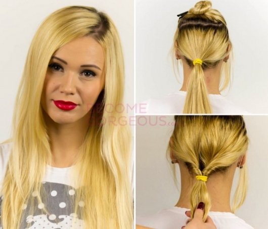 Ето Ви една проста прическа, която можете да направите само за пет минути. Трябва ластик за коса, няколко черни фиби и гребен за тупиране.