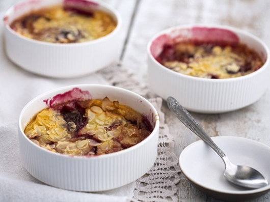 Сливите се разполовяват и се почистват от костилките. Готвят се около 3 минути в 20 г масло, като се поръсват с 40 г захар. Трябва да омекнат леко и да пуснат сок, но не и да се разкашкат.