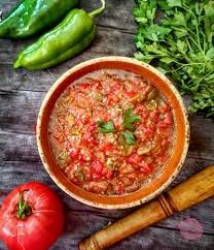 Лукът и чесънът се обелват и нарязват на ситно като се счукват с малко сол. Прибавя се печения пипер, нарязан на дребно и настърганите домати.
