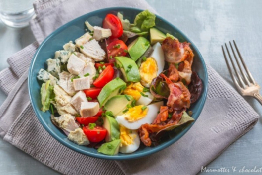 След това в редички подредете останалите продукти: яйца, домати, пилешко, авокадо, бекон. Сложете синьото сирене върху всичко или върху пилето.