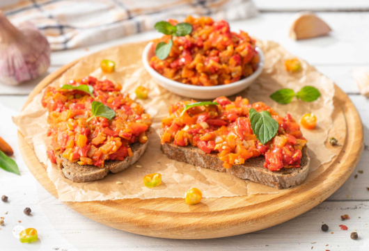 Сладките чушки, лютите чушки и патладжанът се изпичат. След това се задушават в съд с капак или в плик. Слагат се в цедка и се оставят за около час, да се отцедят от тъмния сок. Обелват се, почистват се от семките и се накълцват.