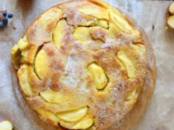 ПРОДУКТИ: 2 дюли, 250 г брашно, 250 г захар, 250 мл прясно мляко, 2 яйца, 1 с. л. бакпулвер, кората от 1 лимон, 1 щипка сол, пудра захар за поръсване.