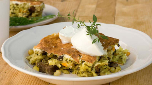 ПРОДУКТИ: 800 г картофи, 3 яйца, 1 малка глава лук, 150 г овче сирене, 150 г овче кашкавал, 6 фини кори за баница, 7–8 стръкa пресен джоджен, 2 щипки самардала (или прясна), 2 щипки чубрица, 2 с. л. олио, масло за намазване.