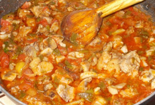 Сложете капак на тигана и след като поври месото и остане на мазнина, сипете доматения сок, доматите, лука, гъбите, чесъна и пушеното месо.