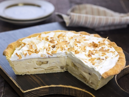 Нарежете бананите на колелца и ги наредете върху изпечения блат. Отгоре налейте крема. Смесете белтъците с остатъка от захарта и разбийте на гъст сняг, с който покрийте повърхността на пая. Запечете десерта в загрята на 150 градуса фурна за около 10-15 минути, до готовност на белтъците.