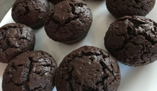 По желание може да добавите есенция ром, някакъв вид ликьор, ванилия. Добавяте брашното и какаото, като продължавате да бъркате само с бъркалка, ще получите гъста смес, към която аз лично добавям 2 с.л. прясно мляко, разбърквам и разпределям във формички за мъфини или в тава с хартия за печене. Пека на 180 градуса на средно ниво около 20-30 минути, за по- сигурно проверявам с клечка, като тя трябва да излезе с леко влажни трохи. Охлаждам върху решетка и нарязвам на квадрати, а кексчетата просто се вадят от формите. Препоръчвам поднасянето на мъфините с топка ванилов сладолед и течен шоколад. Става дъвчащо, точно както трябва да бъде./M,gotvach.bg/