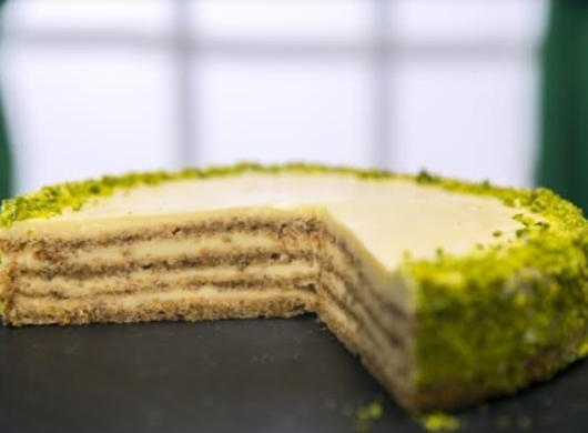 Тортата се залива с глазурата, декорира се с накълцан шамфъстък и се оставя да престои, докато глазурата се втвърди.