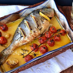 В удобна тавичка налейте зехтин. Поставете рибата, полейте я с чашка бяло вино и 1-2 с.л. зехтин.
