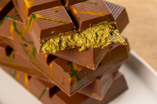 Външната част трябва да е сладка и гладка, но истинската „звезда“ на този шоколад е пълнежът от шам фъстък, тахан и кадаиф, които заедно му придават кремообразно-хрупкава консистенция и орехов вкус и оставят без думи всеки, който го опита.