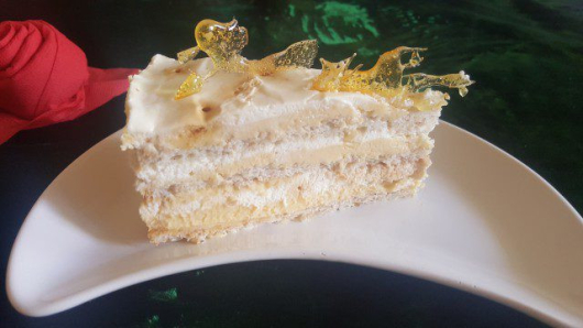 Украсете тортата с натрошен карамел или карамелизирани лешници.