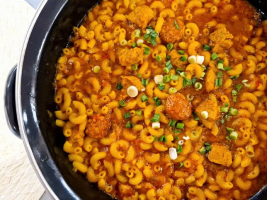 Трябва да остане малко течност. Дръпнете макароните с месо от огъня, посолете, ако е нужно (не слагам сол предварително, защото кубчетата бульон понякога са достатъчни).