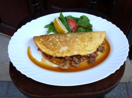 Нарежете обезкостеното месо на късчета и го задушете в мазнината, след което последователно прибавете кромида, нарязан на тънки кръгчета, доматите, нарязан на дребно, лютата пиперка, виното и подправките. Задушавайте, докато сместа остане на мазнина. При поднасянето опържете 4 омлета от по 2 яйца, разпределете кавърмата в тях, прегънете на две и внимателно поставете в чиниите за сервиране. Лакомник