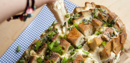 Нарежете хляба както е показано, внимавайте да не прережете долната кола, за да не развалите джобчетата. Пъхнете в тях кашкавал, топено сирене, поръсете с риган, поставете пресен кромид, който придава невероятен вкус на кралския хляб. Завийте в алуминиево фолио и печете 15 минути в средна фурна. Ако фурната ви е много силна съкратете печенето. Да ви е сладко.