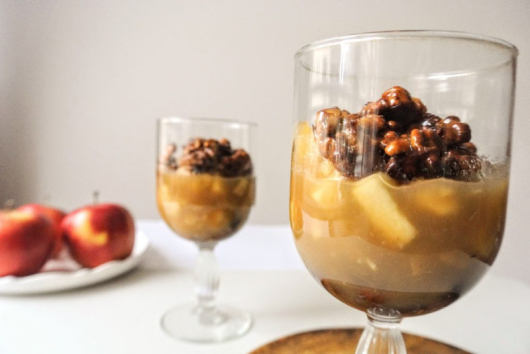 Печените плодове и разполовените гроздови зърна се разпределят в купички и отгоре се слага от крема.
