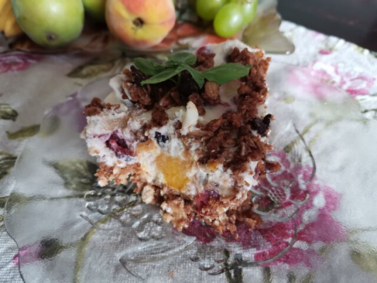Плодовата торта се поръсва с шоколадова гранола и се прибира в хладилник за поне 3 часа.