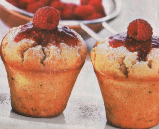 Загрейте фурната на 200 градуса. Измийте малините и ги подсушете. Смесете малините с яйцето и сметаната. Смесете брашното с набухвателя, щипка сол и 100 г захар. След това прибавете сместа от брашното със сметаната и 150 г малини. Разделете тестото в малки форми за кекс и печете за около 20 минути. 200 г от малините смесете с портокаловия сок и 30 г захар, като с тези продукти трябва на направите пюре. получените кексчета полейте с малиновия сос и ги украсете като поставите по 1 малина на всяко кексче./lakomnik.bg