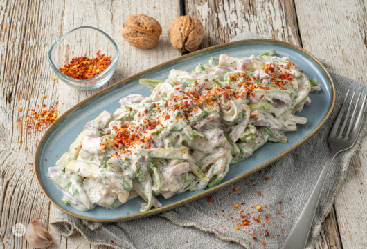 Хрупкаво, свежо, студено, леко пикантно – млечна салата, но не с краставици, а с леко задушени тиквички, лук, орехи. Лятото има нов вкус и непременно трябва да го опитате. Ако искате да разнообразите салатата от домати, краставици, чушки и лук, ето ви интересна идея.