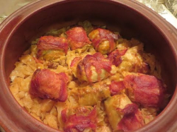 Най отгоре сложете овкусеното и нарязано на тънки пържоли контра филе. Полейте със доматения сок и печете в умерена фурна до готовност.