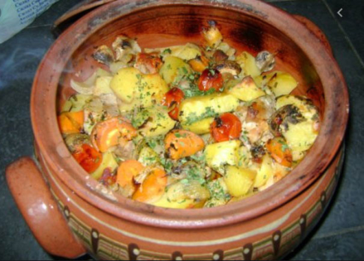 На дъното на глинен гювеч сложете половината месо, след това половината от останалите продукти, пак месо и накрая изсипете и другата част от продуктите.