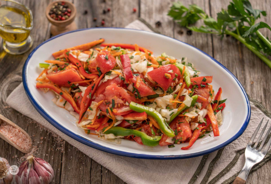 Нарежете на тънки ивици зелето и чушките, накълцайте чесъна. Настържете на средно едро ренде морковите, а доматите нарежете на едри парчета. Нарежете на ситно магданоза и листата от целина. Смесете всичко, посолете на вкус и подправете с олиото и оцета.