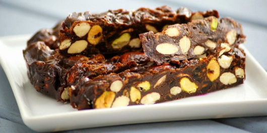 Счукайте лешниците и бадемите, сложете ги в купа заедно със захаросаните плодове /нарязани на кубчета/, брашното и подправките.