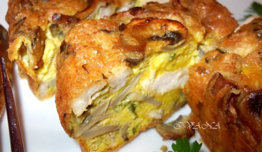 Поднесете печения омлет с пиле и гъби със салата по желание!