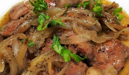 Сложих няколко парченца масло и пекох още 30 мин. Един път извадих от фурната и обърнах дробчетата с лук!/gotvach.bg/