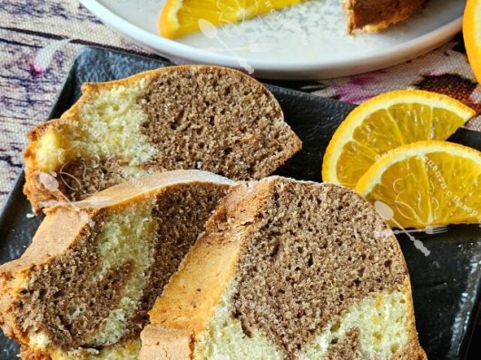 Първо, хубаво се разбиват яйцата и захарта. След това се прибавят останалите съставки без какаото. Отново се разбива хубаво. Отделя се около 1/3 от сместа и се оставя настрани. В другата част се слага какаото и се разбива отново. Първо се сипва от кафявата смес, после бялата и накрая пак кафявата.