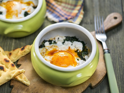 Във всяко се натрошава сирене и се чуква по едно яйце.
