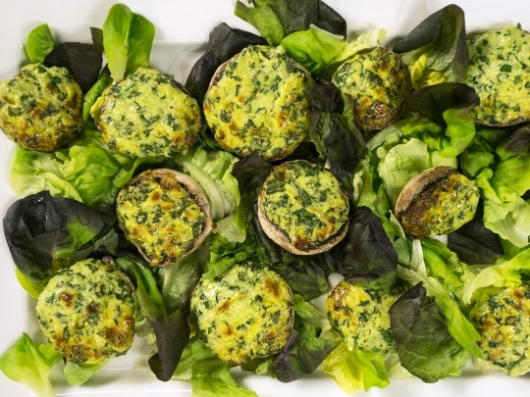 Гъбите се почистват и пънчетата им се отстраняват. Крем сиренето се смесва с настъргания кашкавал, сухия чесън, яйцето, наситнения спанак, сол и черен пипер на вкус.