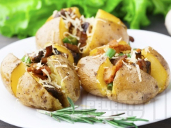 Пълнени печени цели картофи с гъби кралска печурка, пресен лук, масло и бекон на фурна