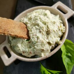 Кравето сирене се натрошава и се смесва с крем сиренето и зехтина.