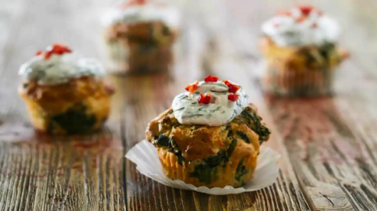 Сместа се разпределя във форма за мъфини с намазнени хартийки за печене, като отворите не се пълнят до горе. Мъфините се пекат в загрята на 180 градуса фурна за 10–15 минути и се оставят да се охладят.