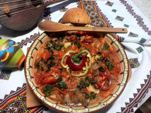 Поднесете сръбска Мучкалица в глинен съд, поръсена с магданоз и прясно изпечена питка.