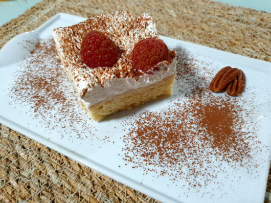 Декорирайте турския сладкиш (албански) със сладка сметана и подредете малините отгоре.