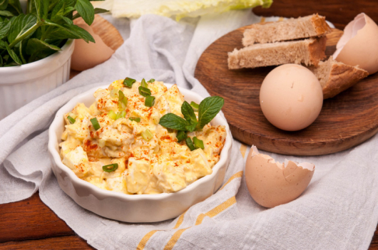 Първата стъпка от рецептата за яйчена салата с майонеза и пиле е варенето на яйцата и пилето. Яйцата трябва да бъдат твърдо сварени за около 10 минути. Пилето също трябва да се свари добре, като за приготвяне на салатата може да ползвате всякакво пилешко месо - бяло месо, бутчета, или каквото имате под ръка. След като яйцата са сварени ги обелете, а пилето нареже на ситно.