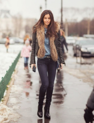 Заиграйте се с кожения елек, като го съчетаете с дълго палто. Главната редакторка на Vogue Australia, Кристин Сентенера, е заложила на дълъг памучен шлифер до глезените в тъмно синьо и за повече драматизъм във визията си е облякла и кожен елек с косъм отгоре. За краката си тя е предпочела черно-бели обувки с остър нос. Косата и грима са в максимално естетсвен вид, за да не изглежда прекалено официален и вечерен тоалетът. По същия начин, можете да носите и дълги рокли с ръкави.