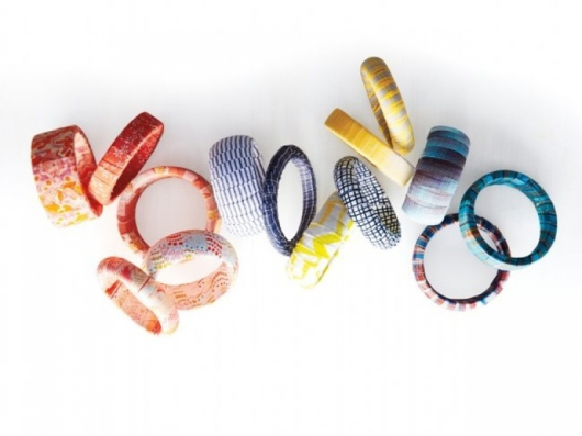 За първата идея ще ви трябват дървени или пластмасови гривни и няколко парчета плат. Изберете ги в любимите ви цветове или с животински принт, райе, цветя и др. От парчетата плат изрежете ленти с широчина около 1,5 см и минимум дължина 40 см.