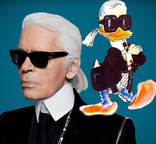 „Скъпи Доналд, седем е страхотно число — 10 пъти по седем е още по-добро! Честит рожден ден! С любов, Карл“, бяха думите на дизайнера по случай седемдесетгодишнината на Доналд Дък през 2004, когато е публикувана оригиналната авторска илюстрация, изобразяваща художествения герой в дрехи, присъщи на самия Лагерфелд. В същата година „Дисниленд Париж“ продаде лимитирана колекция от 3000 блузи с изображението.