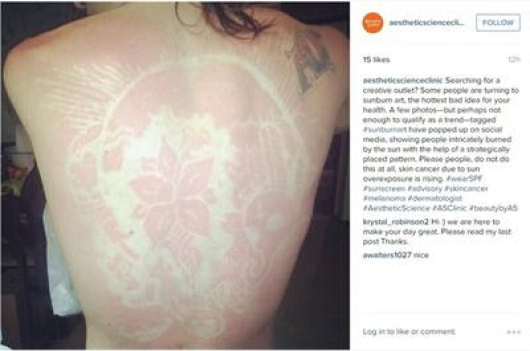 Ако напишете хаштага #sunburnart, ще се ужасите - браузърът ви ще зареди над 70 хиляди нагледни доказателства за опасната тенденция. Толкова е шокираща, че при прохождането й кожните лекари са мислели, че снимките са резултат на случайна немарливост към здравето.