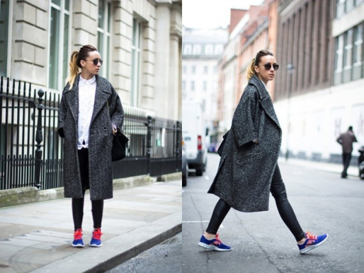 Няма нужда маратонките да се напасват като цвят с палтото - напротив. Контрастът на елегантната връхна дреха със спортна обувка се допълва и с тоталното разминаване в тоновете. Кафяво палто със сини, бели, черни, лилави, та дори и яркочервени трейнъри е демонстрация на стил този сезон! Догодина вече може и да се приема като лош вкус.