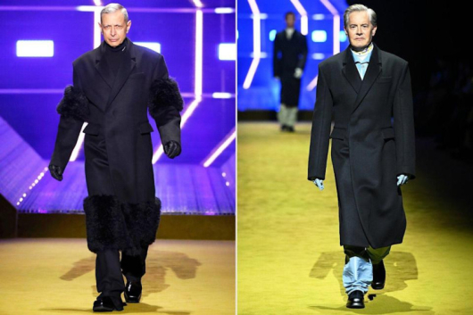 Колегата му, 69-годишният Джеф Голдблум, носеше подобно палто, украсено с черна кожа над лактите и подгъва. Той закри дефилето, показвайки присъщия си комедиен характер, като излезе на сцената от осветен в лилаво тунел и се направи на изненадан, когато се озова на модното ревю. След това уверено се качи на зигзагообразния подиум и показа завидни модни умения.