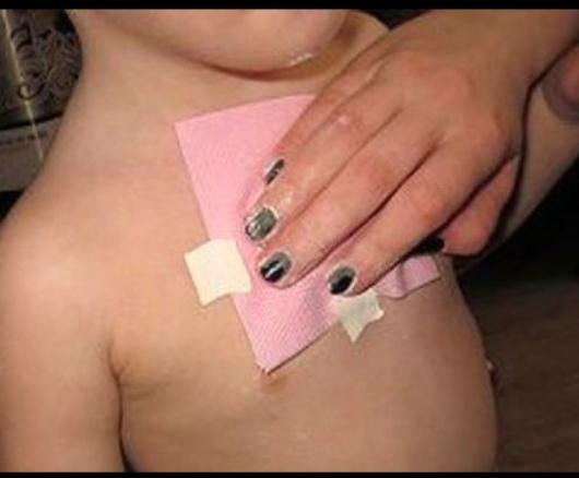 Поставете получената смес върху салфетка или кухненска хартия и увийте в тензух. Поставете получения лек върху цетъра на гръдния кош на детето, след което го закрепете с подходяща лепенка.
