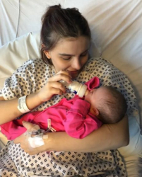 Към края на една от осемчасовите си смени тя почувствала силна болка в корема и гърба и била откарана по спешност в болницата. Там лекарите изненадващо установили, че Аш ражда, а час по-късно на бял свят се появила дъщеря й Скайла.