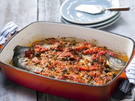 Рибата се поръсва със сол и черен пипер. Слага се в тава, намазана със зехтин и се залива със соса.